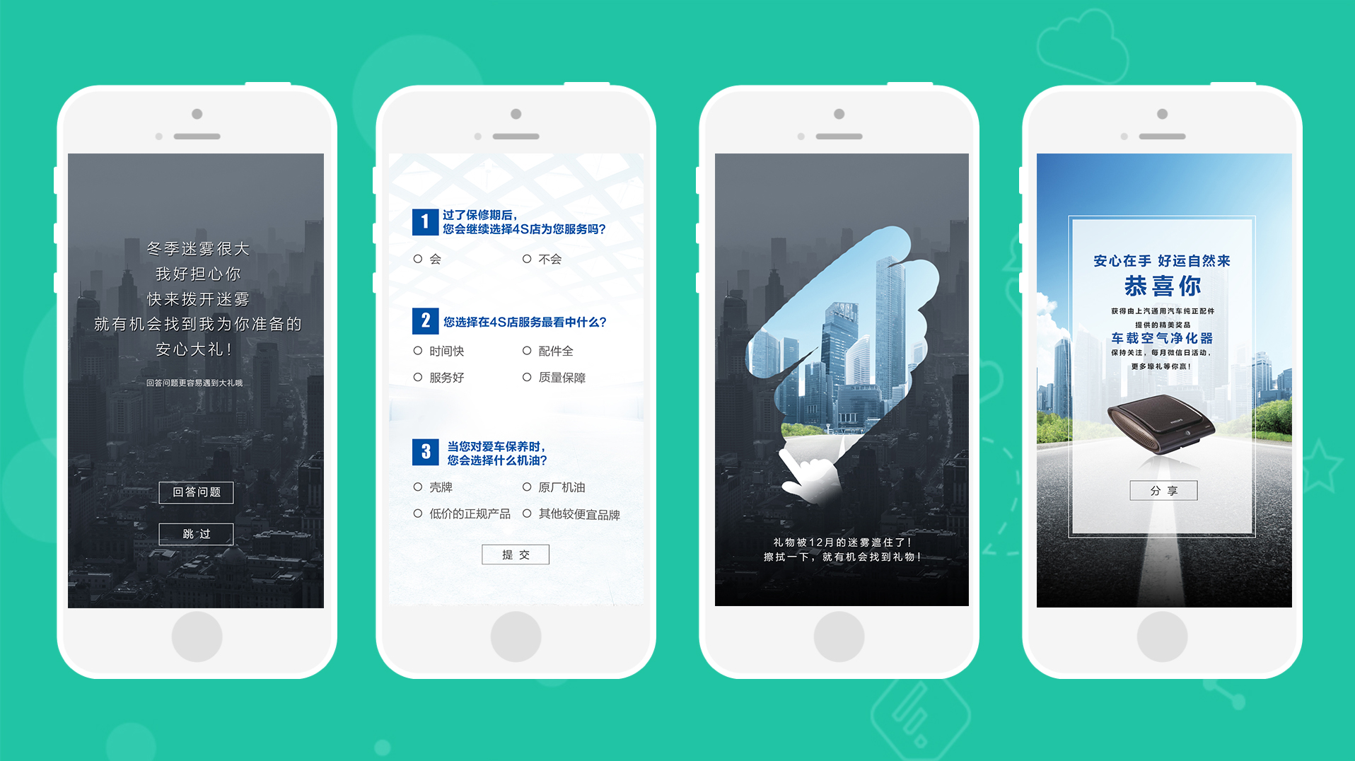 借助全国各地雾霾严重的热点,拨开雾霾,赢取奖品,让全民都能参与其中,实现线上的有效传播,吸引粉丝关注。活动主题:拨开雾霾赢安心大礼。