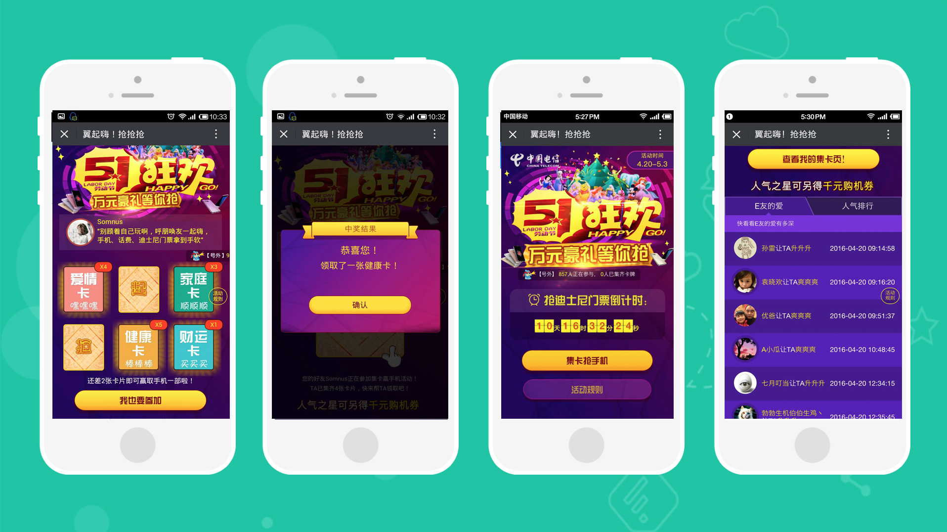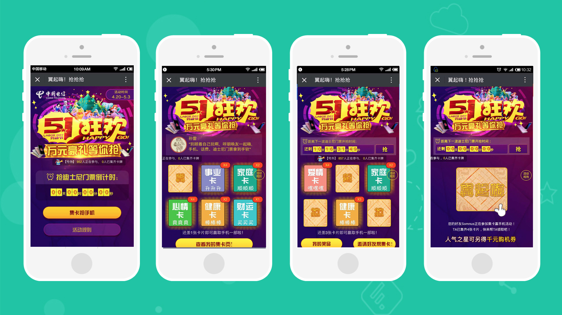五一狂欢,南京电信各营业厅通过微信平台回馈粉丝,集卡得手机,赢迪士尼门票。